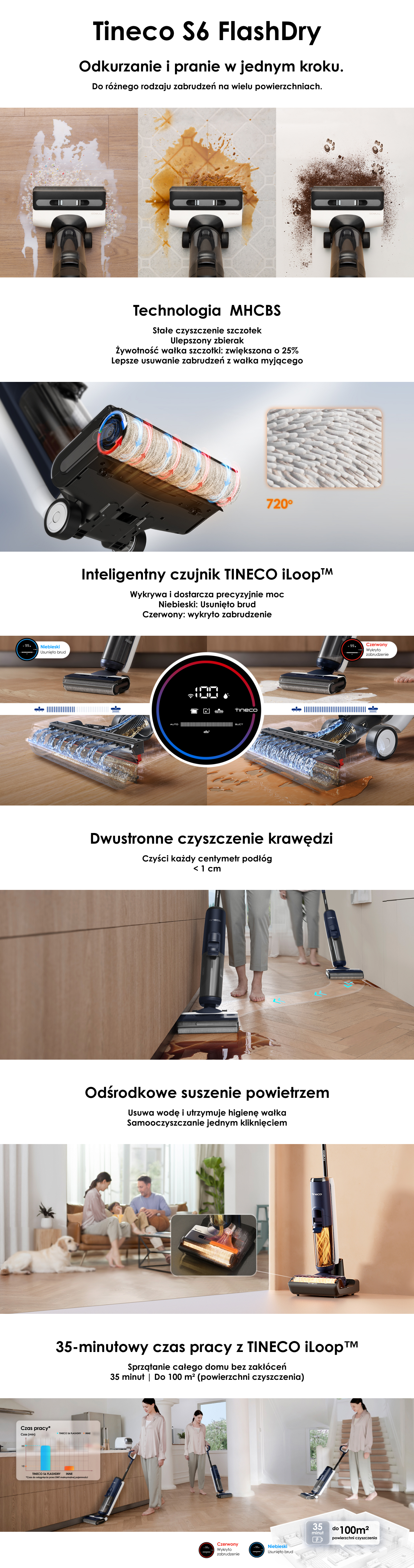 Tineco FLOOR ONE S6 FlashDry Pet to zaawansowany bezprzewodowy odkurzacz myjący, który nie tylko skutecznie usuwa zabrudzenia, ale również myje podłogi, radząc sobie z trudnymi plamami. Dzięki silnikowi bezszczotkowemu oraz inteligentnym technologiom, takim jak zaawansowany wyświetlacz LCD i obsługa przez aplikację mobilną, sprzątanie staje się bardziej efektywne i wygodne.