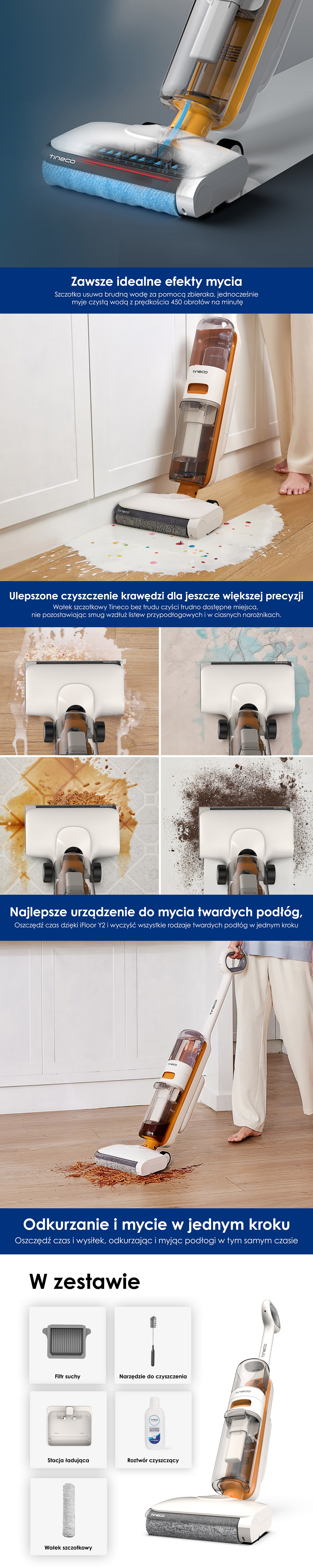 Urządzenie łączy dwie funkcje – odkurzanie i mycie – dzięki czemu w jednym przejściu usuwa brud, kurz, plamy czy sierść zwierząt. To szybkie i praktyczne rozwiązanie dla każdego domu.